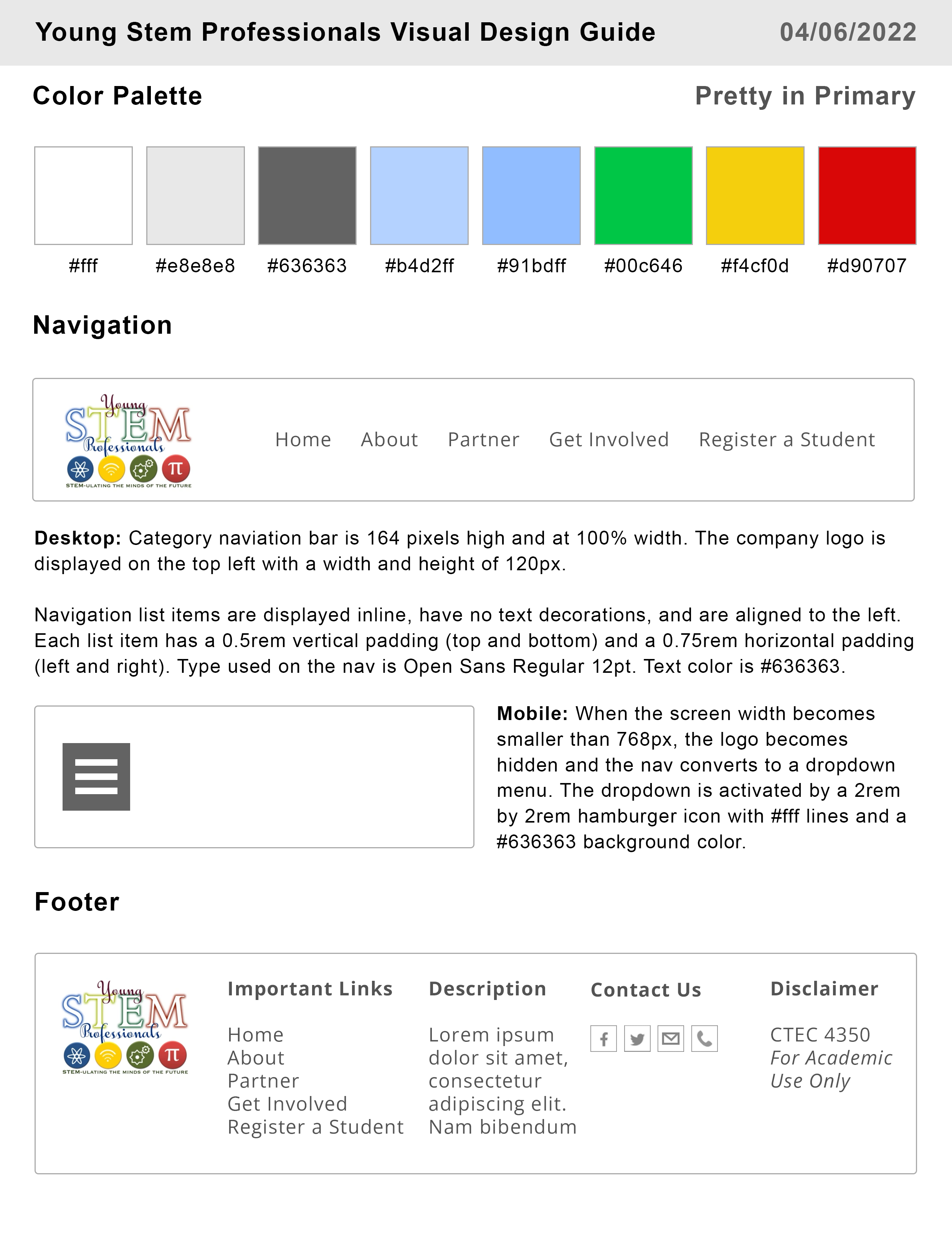 Throughout this semester-long project, our team’s goal was to optimize the organization’s website by increasing functionality (through user forms), accessibility, and consistent brand identity. Check out the STEM-ulating full website or our proposal video down below!